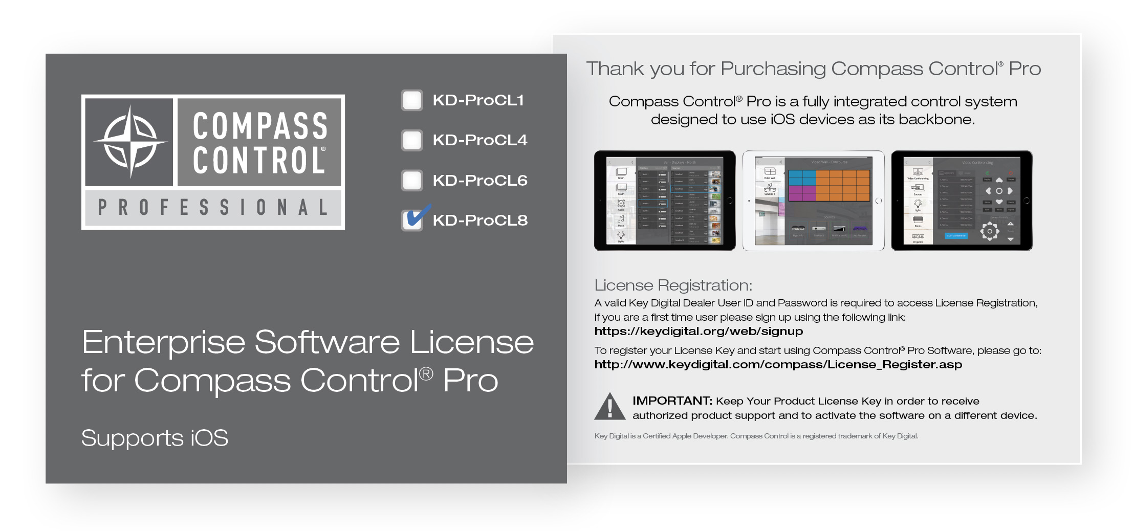 Use KD-ProCL licenses to activate your iOS devices to become live Compass Control® Pro Controllers programmed with your custom project file. For Compass Controlled sites, each iOS controller requires an activation license. For Compass Control® Pro Integrators and Programmers, a licensed iPad means unlimited amounts of loaded projects with favorite project retrieval from archive for ease of demonstration or system control.