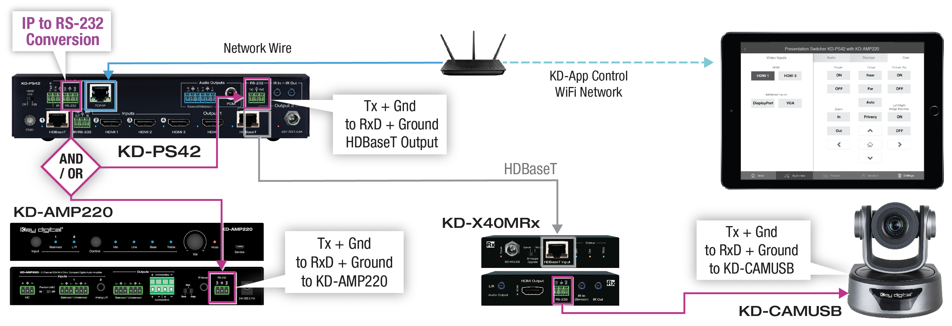 - Presentation Switcher Kit: Includes KD-PS42 and KD-X40MRx. Add KD-X2x1WDTx or KD-2x1WVTX wall plate HDBaseT transmitter for plug-in on walls, floor and table boxes