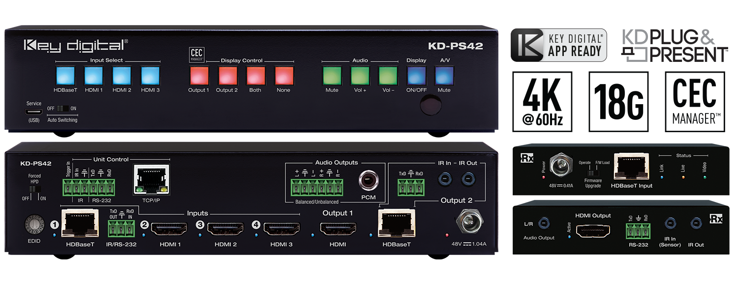 Key Digital® KD-PS42 is a 4K/18G KD-App Ready Presentation Switcher kit with CEC Manager™, auto switching, and audio de-embedding creating a user-friendly, simplified presentation system. KD-PS42 features three HDMI and one HDBaseT input which integrates natively with Key Digital wall plate HDBaseT transmitters. Mirrored HDMI and HDBaseT outputs enable audience + presenter views and the HDBaseT output marries in with the included KD-X40MRx for integrating monitors or projectors up to 40m / 131ft away when the selected source is outputting 4K/UHD (up to 70m / 230ft at 1080p). Designed for professional audio video installations in conference rooms, board rooms, classrooms, lecture halls, auditoriums, and more, KD-PS42 enables multiple video sources to be displayed on up to two connected displays while analog (balanced/unbalanced) and digital (PCM) audio de-embed ports feed audio of the selected source into an amplifier, DSP, or sound bar. Integrating KD-PS42 with KD-AMP220 and KD-CAMUSB will enable an app-ready all-in-one solution for control of video switching, sound and speech enforcement, and PTZ camera control. Key Digital CEC Manager™ enables basic controls of the connected displays for a simplistic all-in-one integration system. KD-PS42 presentation switcher supports all SD, HD, VESA and Ultra HD/4K video standards with HDR header information included in a variety of 4K EDID handshakes. In addition to IR, RS-232, and TCP/IP control, KD-PS42 can also be controlled via trigger voltage and features status monitoring LEDs.
