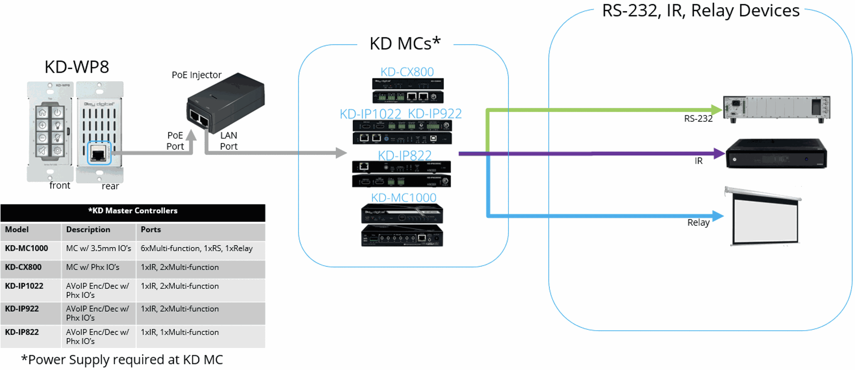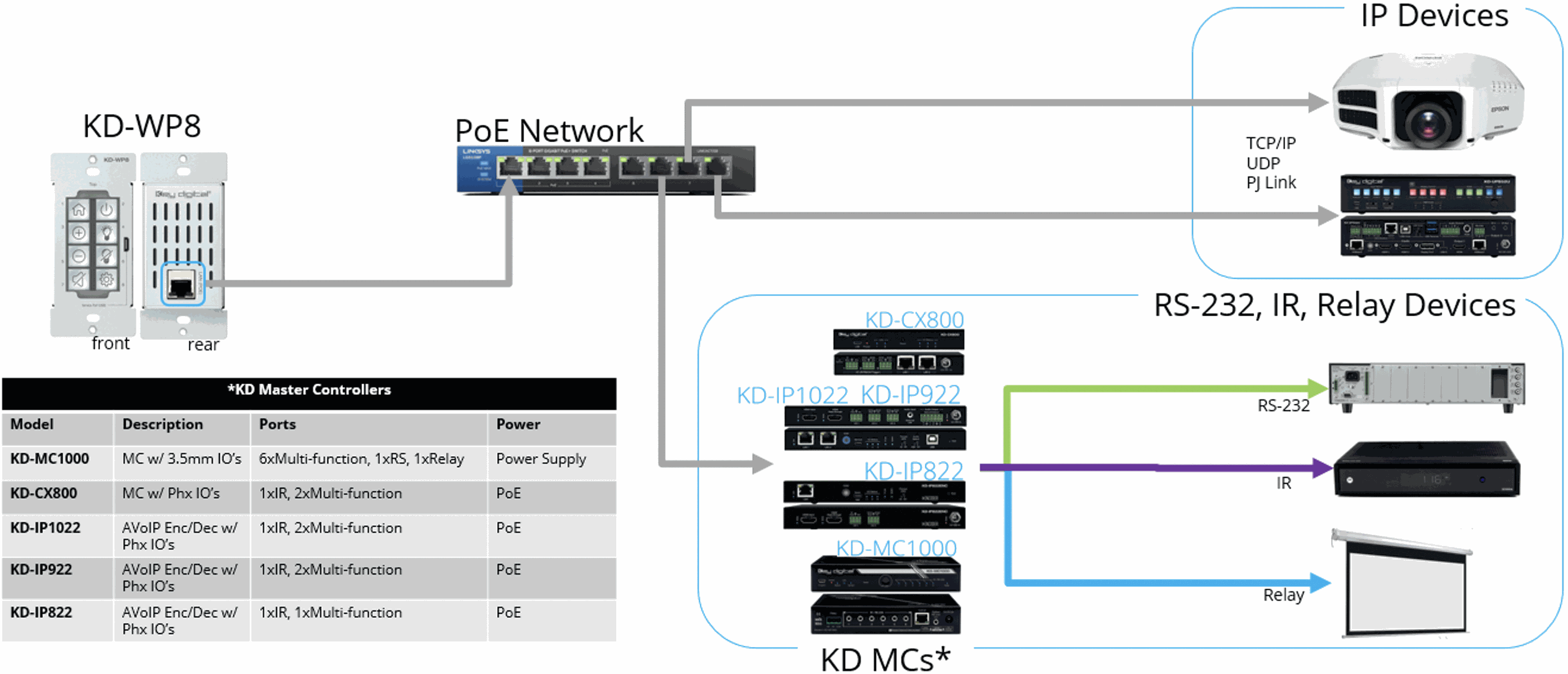 IR, RS-232, and Relay Control: Add KD-CX800, KD-MC1000, or KD-IP822/922/1022 master controllers for native control or IR, RS-232, or voltage relay devices.