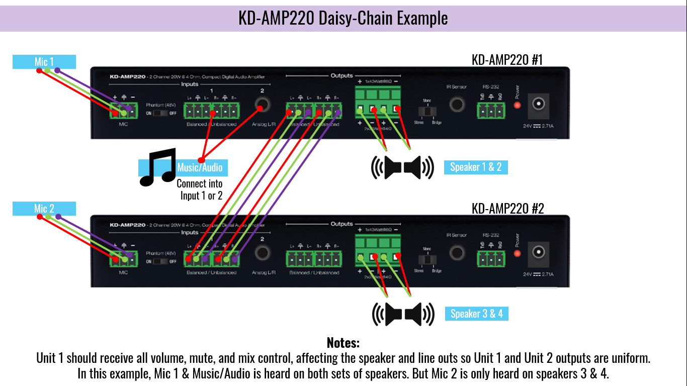 The KD-AMP220 is a 2x20-watt Class-D amplifier with an 8 Ω speaker output ideal for installation in presentation spaces. Input connections accommodate microphone, line level balanced/unbalanced, and line level 3.5mm stereo analog audio inputs. The output is a mix of audio from the microphone input and the selected audio input. Microphone and output volume levels may be variably controlled via IR, RS-232, or the front panel, and speaker level output may be set to bridge stereo or mono mode.