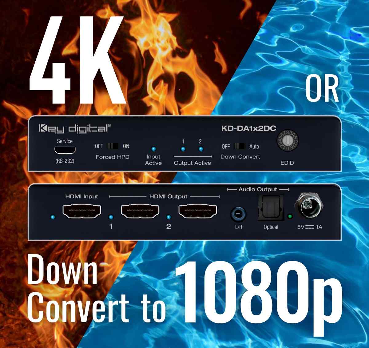 KD-DA1x2DC is an HDMI splitter/distribution amplifier with 4K 18G resolution signal support and a 4K to 1080p resolution down conversion option. This enables a single HDMI video source to be displayed on multiple video displays, regardless of 4K or 1080p resolution support.