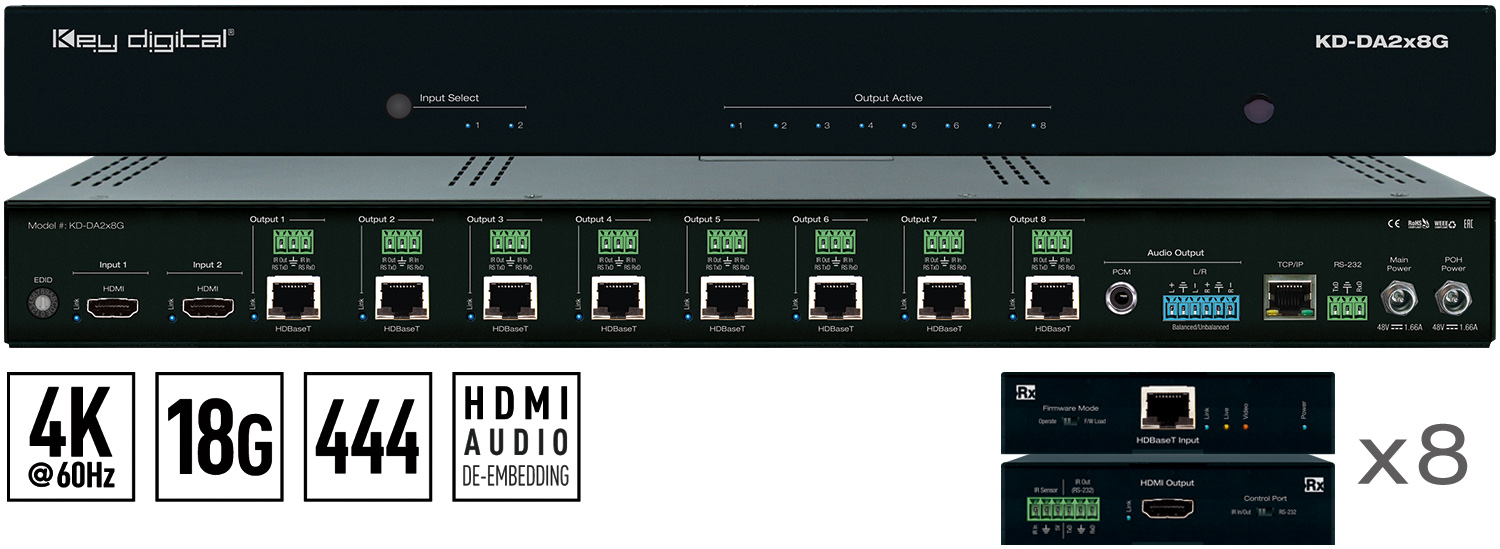 Key Digital’s KD-DA2x4G and KD-DA2x8G are 18Gbps and HDCP2.2 supporting HDMI Switcher + Distribution Amplifier kits with HDBaseT output and 4/8 Rx units included. The KD-DA2x4G/KD-DA2x8G kit is designed for applications such as Digital Signage and other professional AV installation types, where the selected HDMI source is distributed to up to 4/8 displays. All connected displays show the same image at the same time. The 4/8 KD-XDALRx HDBaseT Rx extenders are all powered via HDBaseT from the KD-DA2x4G/2x8G unit, and support extension of resolutions up to UHD/4K up to 250 ft. (76m) using CAT5e/CAT6/CAT6A/CAT7. 1080p resolutions may be extended up to 328 ft. (100m). KD-DA2x4G/KD-DA2x8G is easily integrated into professional AV systems with the audio from the selected source being de-embedded on analog and digital audio connectors, and switching controllable via TCP/IP, RS-232 or IR. KD-DA2x4G/KD-DA2x8G is Key Digital App ready and also controllable by control systems such as Compass Control Pro. EDID handshaking is easily selected via front panel rotary dial and all UHD/4K EDID handshake files include HDR header information.