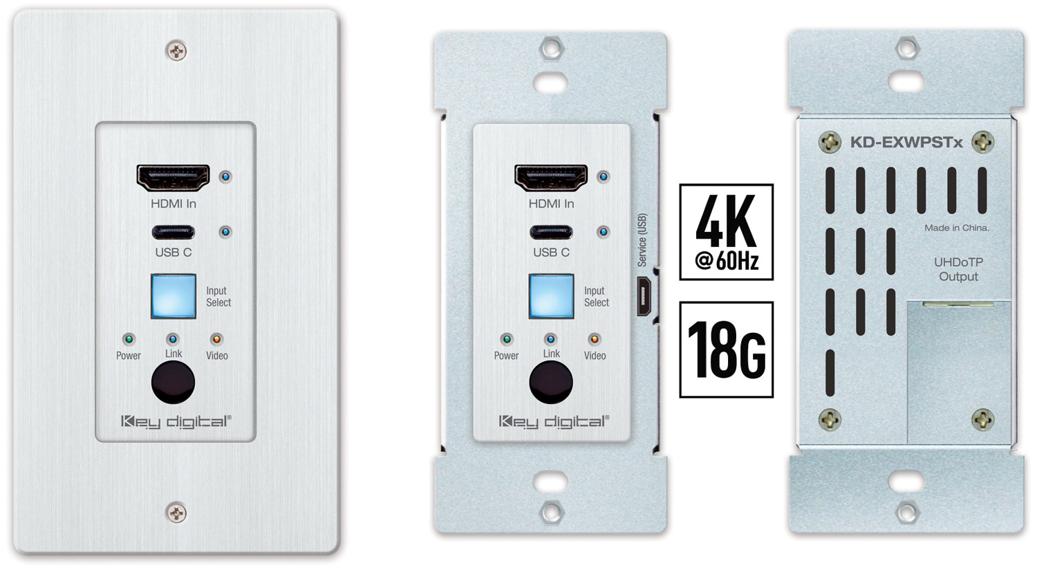 Key Digital® KD-EXWPSTx is a single-gang wall-plate transmitter + presentation switcher with one HDMI and one USB-C input ideal for professional video installation in conference rooms, huddle spaces, classrooms, and more. KD-EXWPSTx utilizes Key Digital’s proprietary UHDoTP extension technology and is natively received by KD-EX18GRx receiver (sold separately). In addition to HDMI video and audio signals, KD-EXWPSTX features an IR sensor on the face of the plate to carry IR for controlling remotely located equipment. KD-EXWPSTX is configured using the USB connection and KDMS Pro software to apply settings like 4K to 1080p down convert, EDID handshake control, and hot plug detection for overcoming common systems integration obstacles. The wall-plate unit fits in a standard US single-gang box and is powered by the Rx unit for convenient installation.