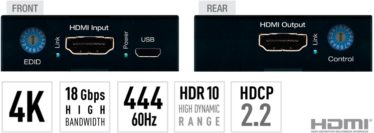 - EDID Control: Internal library with 15 EDID handshakes including 4K with HDR in addition to native EDID data of output/display