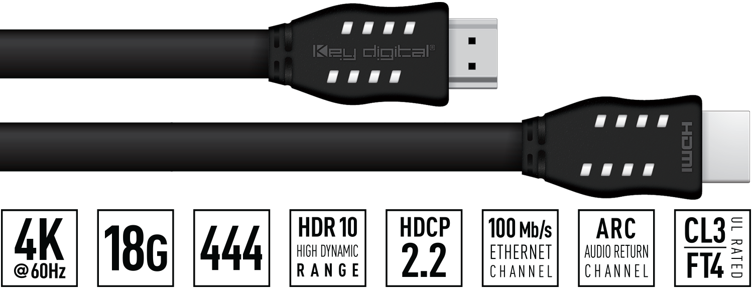 16ft HDMI Cable with support for 4K / UHD resolutions, 18Gbps bandwidth, 4:4:4 chroma, HDR10, and HDCP2.2. CL3 and FT4 fire code rated. 26 guage