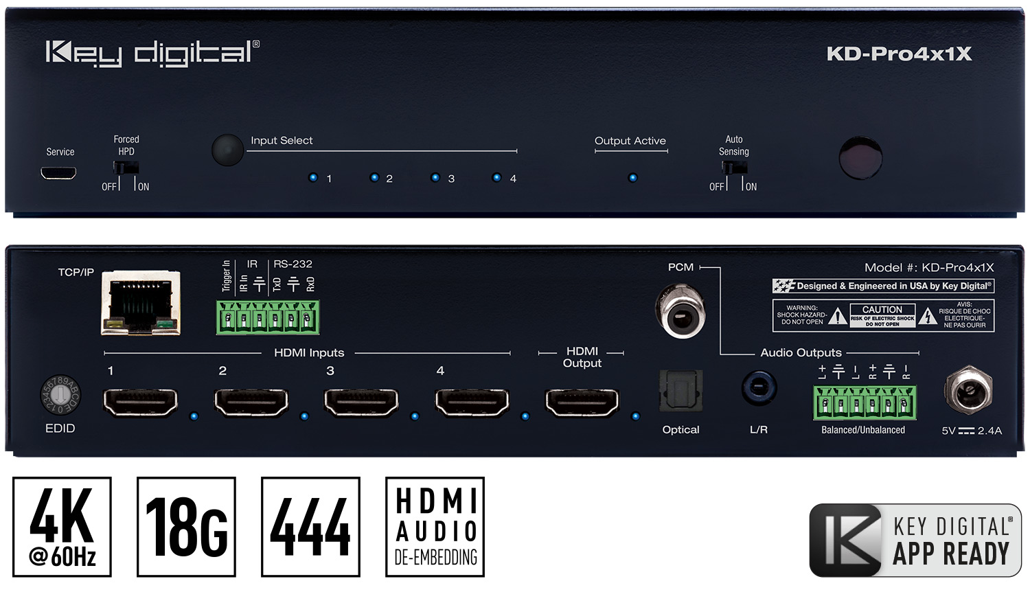4x1 4K/18G HDMI Switcher with De-Embedded Audio Output (Optical/Balanced Audio) and IP Control - DISCONTINUED: replaced with KD-Pro4x1X-2