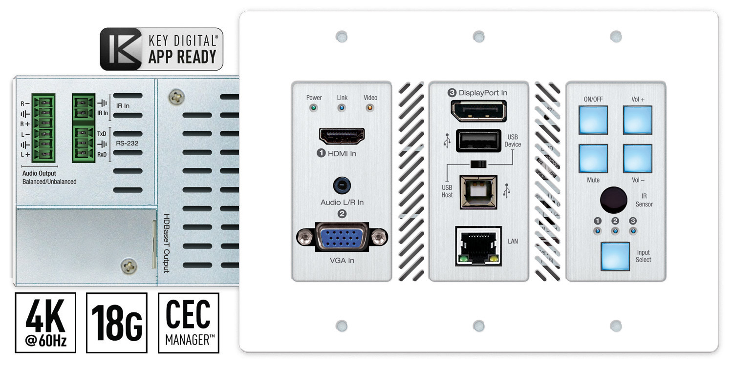 KD-3x1WUTx is an HDBaseT wall-plate transmitter + universal format switcher + soft-codec enabling interface with HDMI, Display Port, and VGA inputs, USB-A and USB-B connections. KD-X3x1WUTx is ideal for professional video installations in conference rooms, class rooms, lecture halls, auditoriums, and more. KD-X3x1WUTx's receivers (sold separately) feature audio de-embedding for ease of integration with audio systems. KD-X3x1WUTx features push-button or IP switching and is KD-App Ready. CEC Display control keypad enables basic controls of the connected display or projector for a simplistic all-in-one integration. In addition to AV signals, KD-X3x1WUTx extends USB 2.0, IR and RS-232 for controlling remotely located equipment. The wall-plate unit fits in a standard US three-gang box and is powered by the Rx unit or Presentation Switcher for convenient installation.