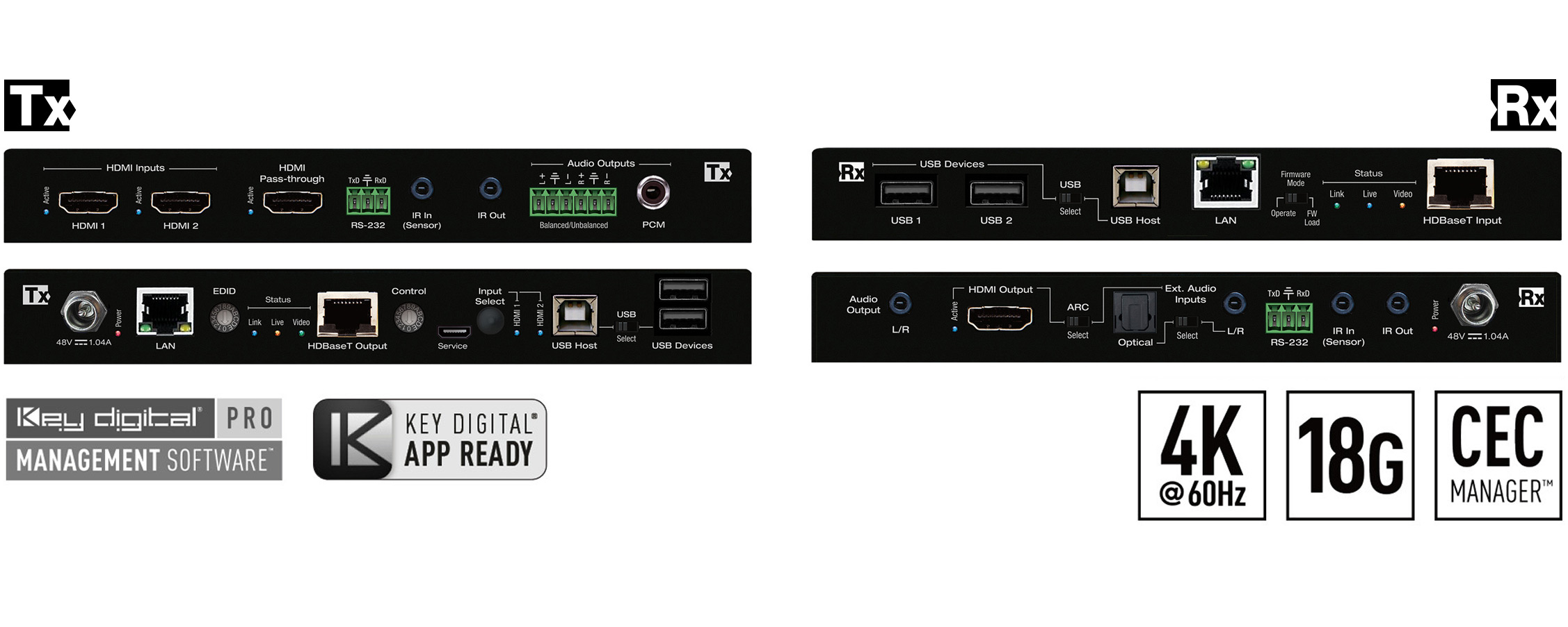 Soft-Codec & KVM Enabling System: USB Host + Device ports on Tx and Rx create connectivity hub for professional USB cameras and microphones, audio DSP, keyboard, mouse, or touchscreen display with connected computer